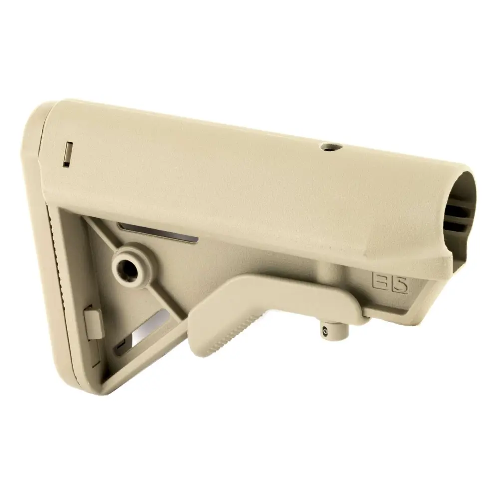 Building upon the success of the B5 Systems Enhanced SOPMOD, B5 has taken the features end users demand; offering them in a lighter, more compact, and stronger buttstock. The Bravo stock maintains the SOPMOD cheekweld, one piece anti-rotation quick disconnect sling mount, no slip cushioned buttpad, and improved suregrip stock latch. The Bravo omits the Sopmods storage capability providing a slimmer profile, and angles the rear of the stock ensuring quick and consistent stock placement against the shoulder and cheek. Made of milspec materials and finishes. Proudly made in the USA.