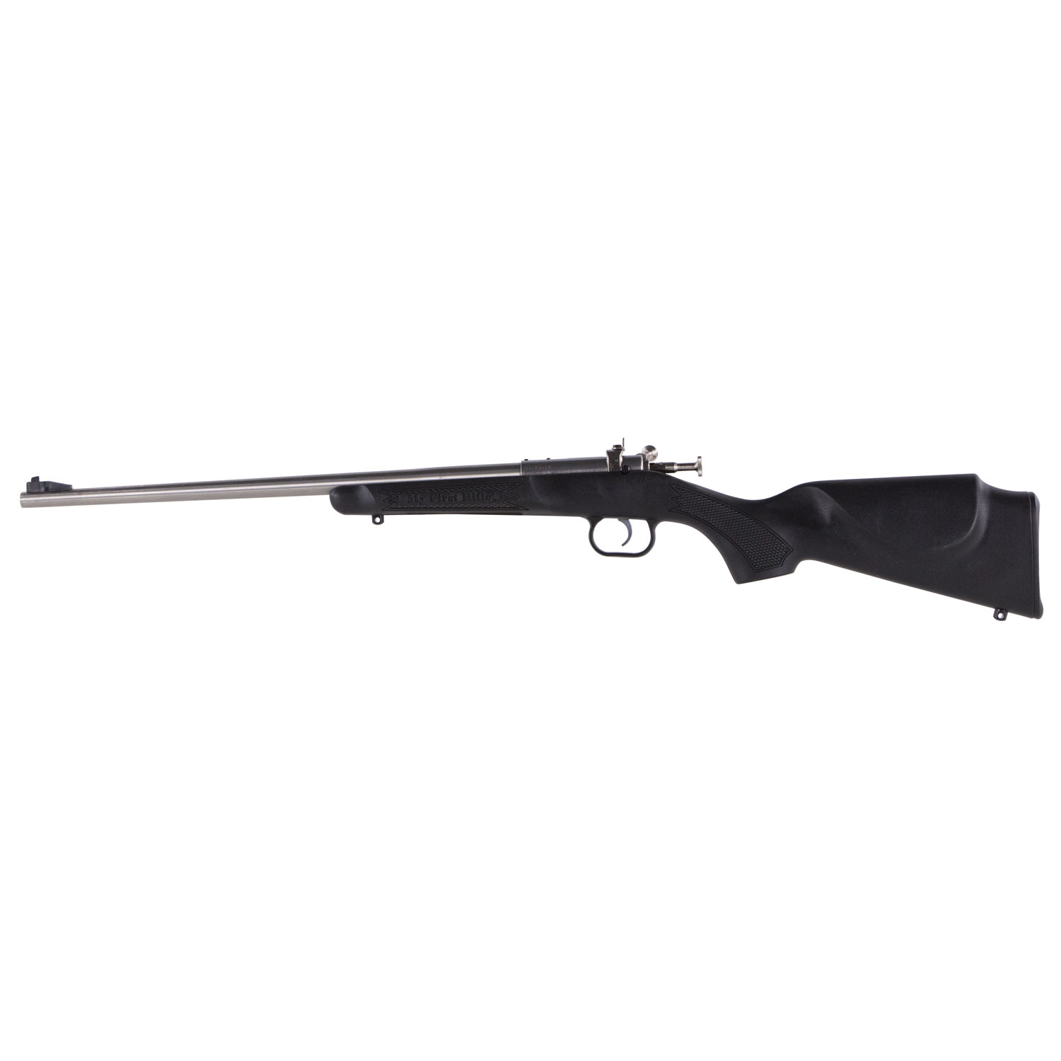 Crickett rifles are the staple of the youth shooting experience. A manual cocking, single-shot, bolt action, it features a rebounding firing pin safety to prevent accidental discharge, 2.5-3 lb. trigger pull, 11.5″ length of pull, and a 16.125″ barrel. Crickett rifles have a fixed front sight, adjustable rear peep sight and are drilled and tapped to accept Crickett scope mounts. This model has a synthetic black stock with a stainless steel barrel.