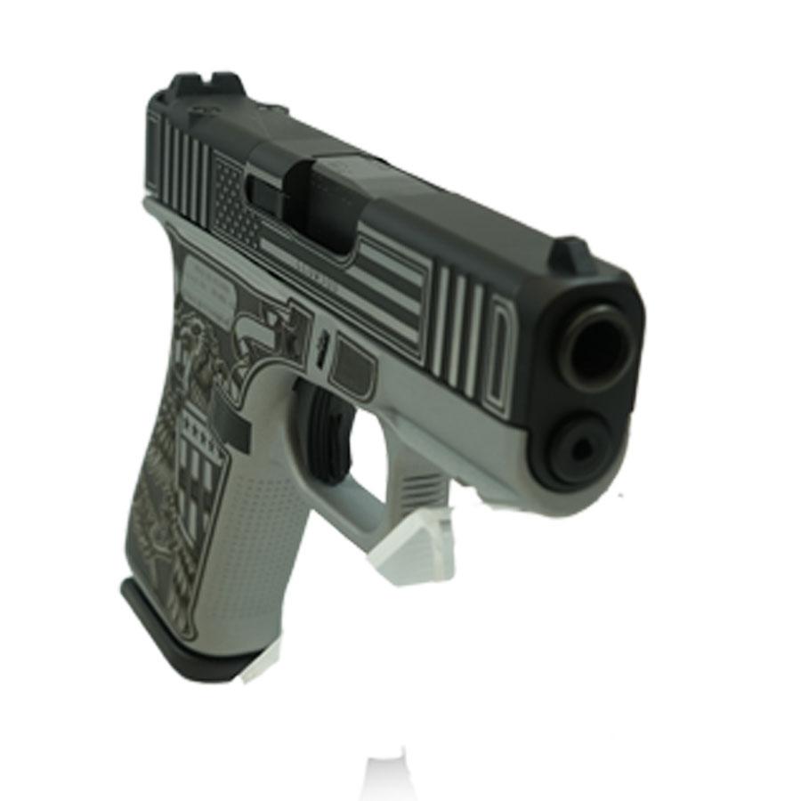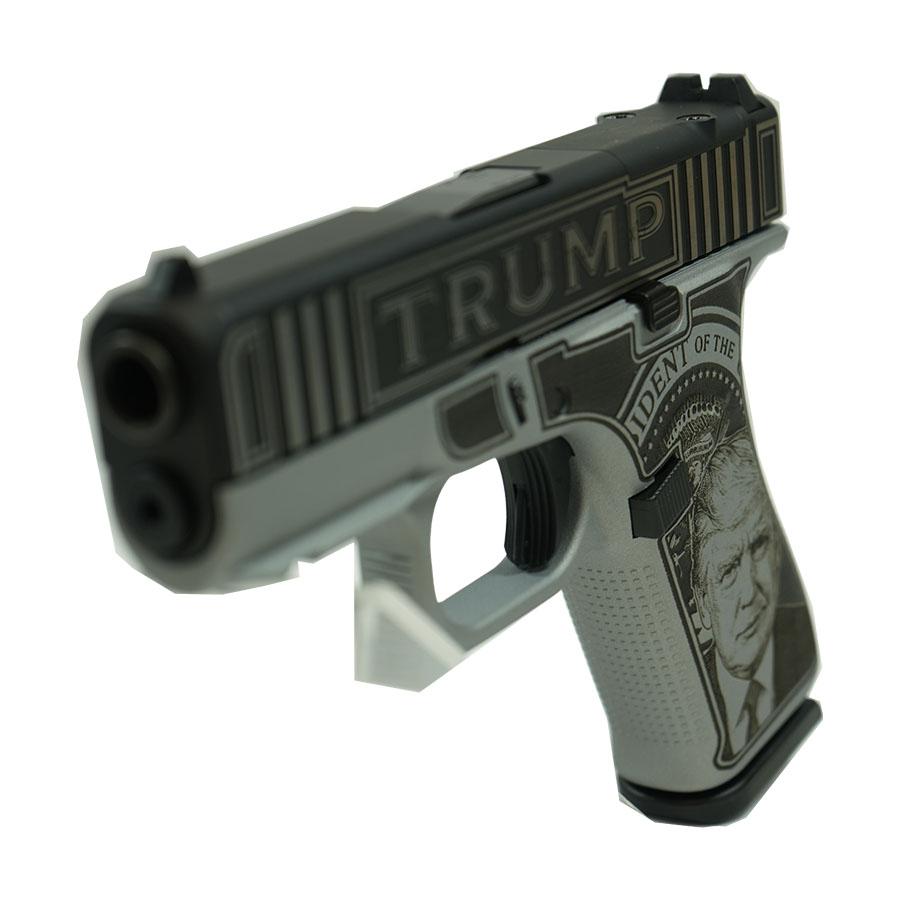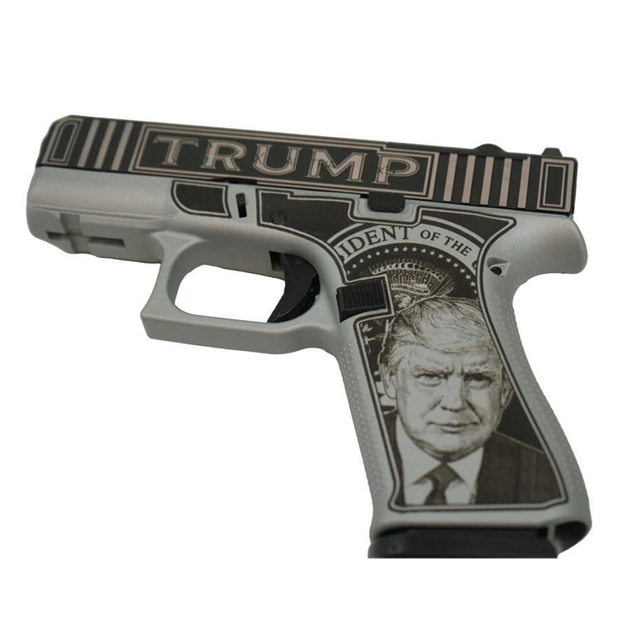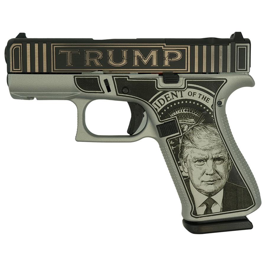 The Glock 43X MOS is a semi-automatic pistol chambered in 9mm, featuring a 10-round capacity and a ‘Trump – Take America Back’ custom design. This model is perfect for those seeking a unique and stylish firearm.