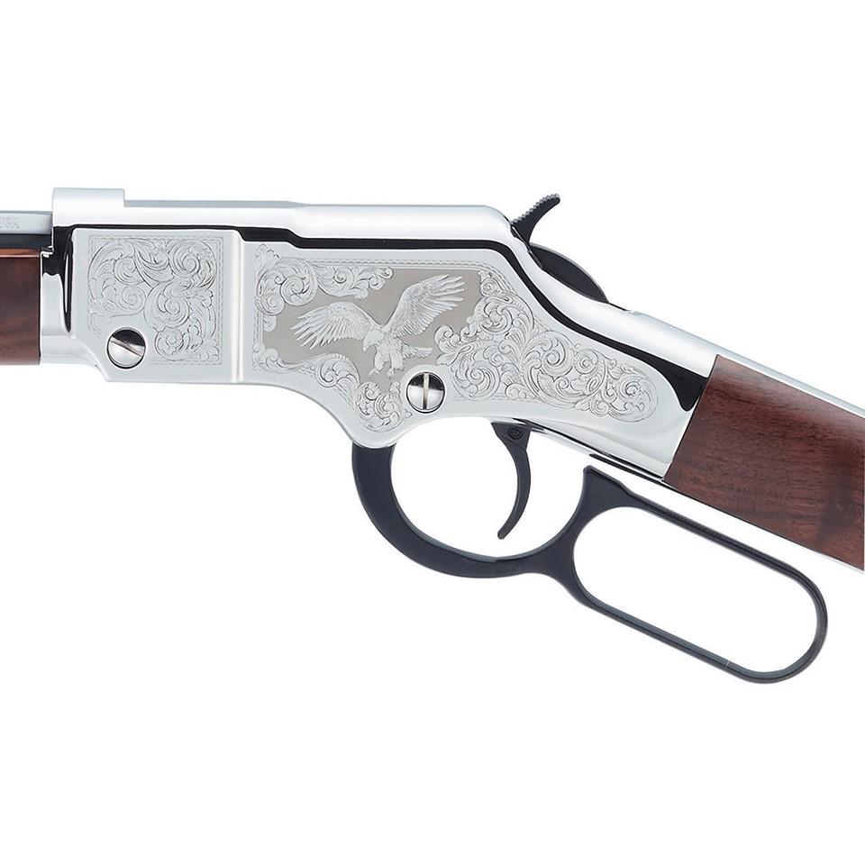 The Henry Silver Eagle 2nd Edition is a fine example of American craftsmanship that you can show and shoot with equal pride.The gun depicts an actual majestic American eagle in flight, wings spread, facing forward into the wind on both sides of the receivers, surrounded by classic 19th Century scroll engraving patterns. The Silver Eagle 2nd Editions brightly polished nickel frame is set off by a slightly darker immediate background for its eagle. Left-handed shooters can safely use our lever action rifles.