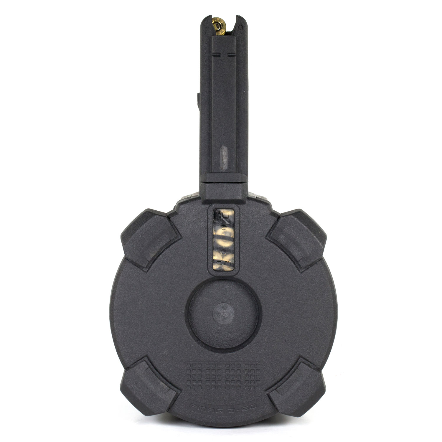 Made in the USA, the PMAG D-60 is a durable, lightweight, highly reliable polymer drum magazine for AR15/M4 compatible weapons. The unique drum configuration keeps the height of the magazine manageable and allows for prone firing and easier storage. Features an easy-to-use loading lever, paint pen dot matrix for easy marking, and a rear window for instant capacity indication.