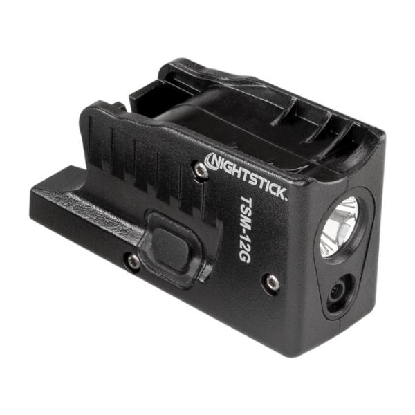 The TSM-12G Subcompact Tactical Weapon-Mounted Light with Green Laser for Glock G26, G27, and G33 sub-compact pistols uses a super-bright LED rated at 150 lumens working in conjunction with a precision-engineered miniature reflector to create a bright white beam of light rated at 104 meters. This weapon light features ambidextrous low-profile switches on each side of the light to operate the momentary-on and constant-on lighting modes or Class IIIa 532nm daylight-visible green laser. These lighting modes include white light, laser, or both light and laser.The two glass-filled nylon plastic housings of the TSM-12G is designed to lock onto the front of the pistol’s trigger guard for secure installation and the lowest profile possible. The weapon light includes a Nightstick MagMate USB magnetically coupled charger, a combination gun lock for secure charging, and an Allen screwdriver for installation and laser aim adjustments.