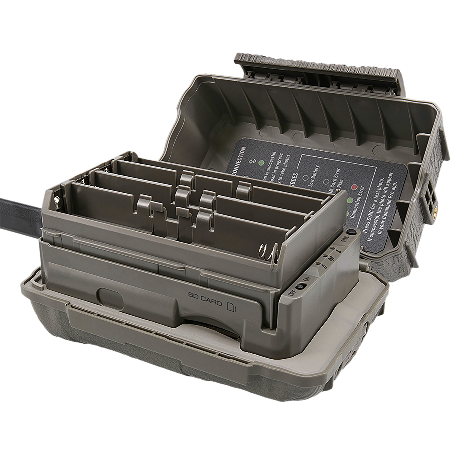 Stealth Cam has further refined the cellular camera segment with the introduction of the all-new Deceptor MAX Cellular Trail Camera. Now with an expanded battery capacity for a total of 16 AA batteries (not included), the Deceptor MAX drastically improves your efficiency afield. Compatible with Stealth Cams upcoming Field MAX assortment of rechargeable lithium battery cartridges and solar panels. Features two pre-installed SIM cards and the Automatic Network Coverage feature that continuously monitors both AT&T and Verizon signal strength, ensuring automatic connection to the strongest network for connectivity via the Command Pro app. On Demand photo and video capture takes and sends crystal-clear photos and videos with audio in real time, while the 36-piece, 940nm No-Glo LED array offers an invisible detection and flash range out to 80 feet. A 0.4-second trigger speed captures as many as nine photos per burst. Weatherproof housing and integrated lock latch. -inch threaded insert for adding mounting hardware. Includes a 12-volt DC auxiliary jack.